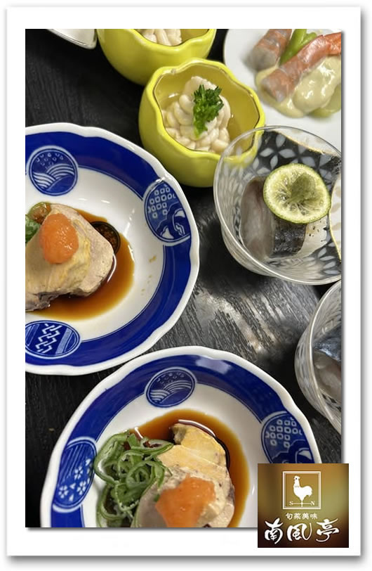 🍀アン肝ポン酢、タラ白子、 シャインマスカットとそら豆、 天使海老の白和え、関サバの小袖寿司🍀 お電話 024-521-8535 福島市南向台2-10-62 お電話お待ちしております。