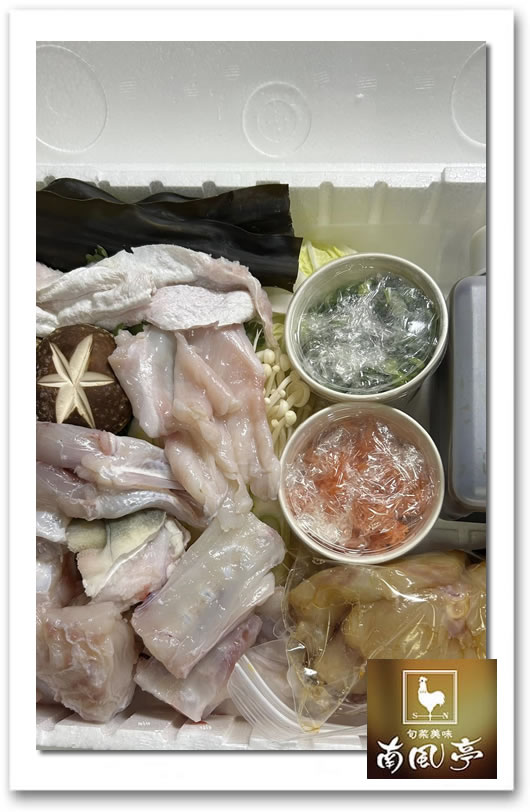 鍋用の日高昆布は水から入れて 沸騰したら取ってくださいね。 トラフグぶつ切り、カラス、ウグイス、 とうとう身葛切り、野菜キノコなど具だくさん。 てっさと同じくポン酢に薬味を入れて お召し上がりください。 身がなくなったらさっと洗ったごはんを入れ 沸騰したら卵をまわしかけてください。 美味しい雑炊の出来上がりです。 右下の袋に入ってるのは唐揚げ用です。 片栗粉をつけて揚げてアツアツをお召し上がりくださいね。