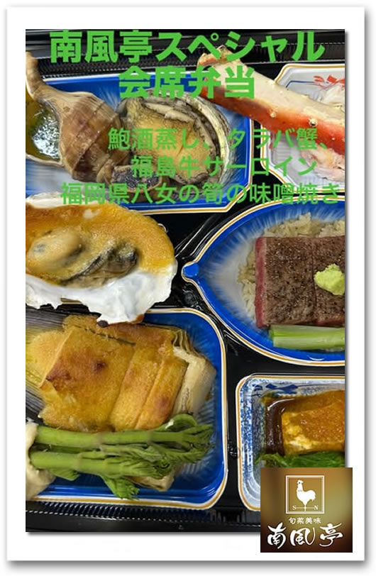 南風亭 スペシャル会席弁当 鮑酒蒸し、タラバ蟹、福島牛サーロイン、福岡県八女のタケノコの味噌焼きなど ¥5400(税込)です。 5日前まで10名様以上でお電話にて承ります。 福島市南向台2-10-62 南風亭 お電話 024-521-8535 お電話お待ちしております。