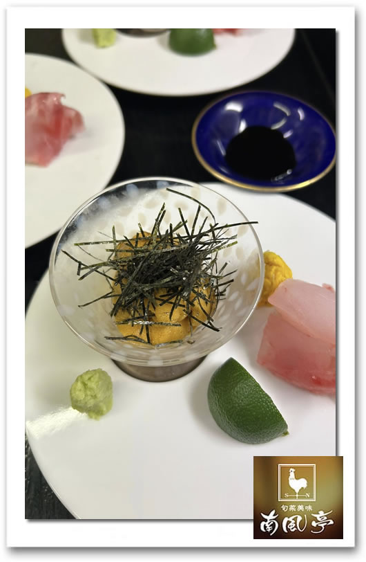 保存料なしの紫ウニと目抜の刺身 福島市南向台2-10-62 南風亭 お電話 024-521-8535 お電話お待ちしております。