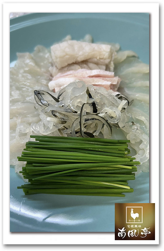 テッサ こちらは テッサ(トラフグのお刺身)です。 南風亭のトラフグは厚切りです。とうとう身 ニカワ、皮、フグねぎとともに自家製ポン酢でお召し上がりください。 🍀お2人様から2日前まで ご予約はお電話にてお願いします🍀