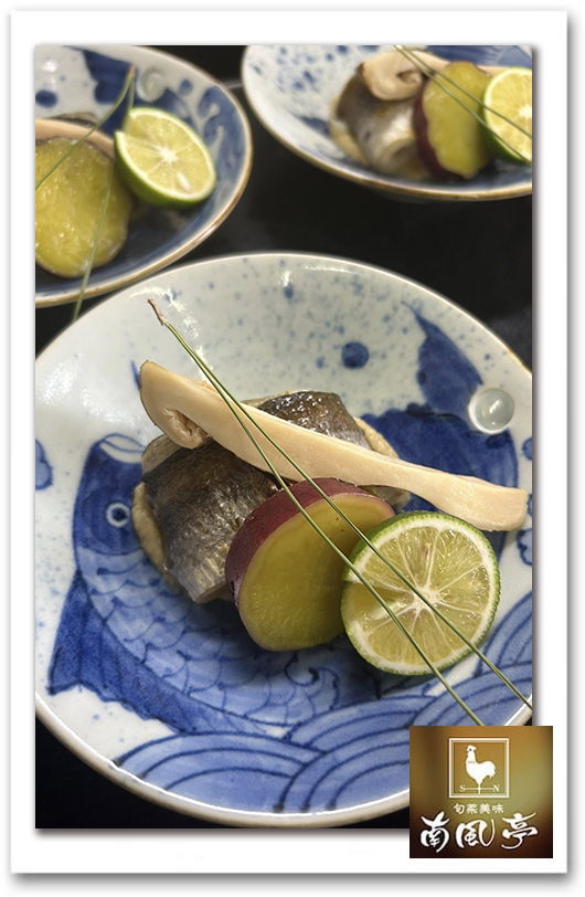 カマスの塩焼き カマスの塩焼き さつまいも 早松茸 すだち、フグ ねぎとともに自家製ポン酢でお召し上がりください。 🍀お2人様から2日前まで ご予約はお電話にてお願いします🍀