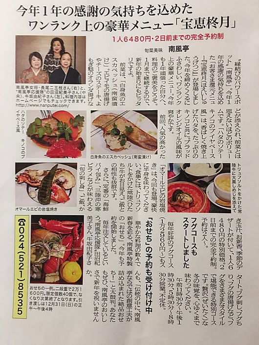 fumie お元気ですか?南風亭女将でございます。 いつもご愛顧ありがとうございます 今日、明日と配布されるリビング新聞に南風亭の冬企画、おせち料理予約のご案内が掲載されております。 今回は「宝恵柊月」(ほえいしゅうげつ)です。 お題は料理取材時に沢山の季語から親方を含め出席者全員で決めます。 予約時に毎回お客様は「えーとあのーイベント中のなんたらかんたらをお願いします。」と。覚えられないですよね。私も「はい、なんたらかんたらオッケーです。」と、私自身もド忘れです(笑)「宝恵柊月」今回は何度スムーズに言えるでしょう❓