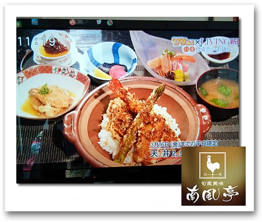 葉羽 画像は、サタふく×LIVING新聞の共同企画でパナックスが制作した南風亭の高麗人参入り天丼セット。2月24日にテレビ放映されました。なお、ロゴで隠れている部分は「天丼2,500円(2日前まで予約)」とあります。