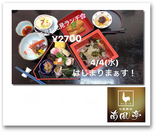 美恵子 南風亭小娘です。 お得な情報をご案内しまぁす♫ やっと暖かくなり🌸春🌸らしーくなってきました✨ 南風亭では 4月4日(水)から桜が散る頃までの期間限定で ☆贅沢お花見ランチコース☆がはじまります! メニューは ☆ターキーのチョレギサラダ🦃 ☆メインは前菜 ☆本日のお造り ☆いなり寿司 ☆具沢山茶碗蒸し ☆デザート あんみつ 以上6品 桜散るまでの期間限定となっておりますが気まぐれな親方なので ご予約の際はお問い合わせ下さい。 お待ちしております!