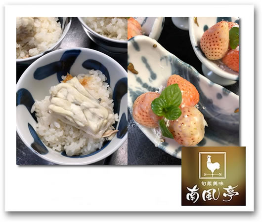 fumie【南風亭オリジナルとらふぐコース】のラスト、四枚目。左はフグの炊き込みご飯。本日のフグは宮崎からの天然とらふぐでした。デザートは長崎産いちごの淡雪。🍓🍓🍓