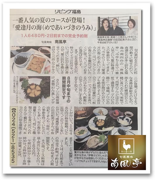 fumie お元気ですか?南風亭です。 🌱🌱海鮮好きにはたまらない夏の特選料理 がリビング新聞に掲載されました🌱🌱