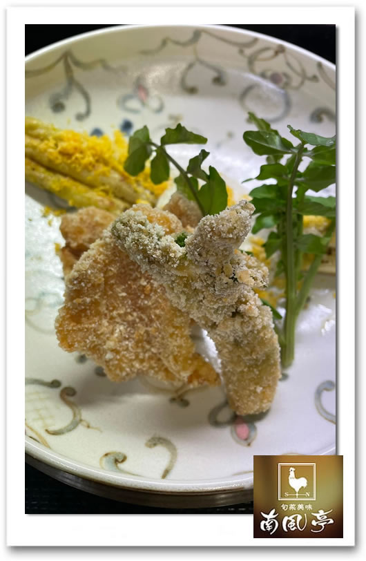 タラの芽とトラフグのおかき揚げ 白アスパラ ミモザソース クレソン