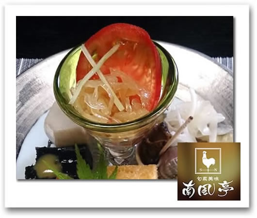 本日のおまかせコースの前菜です。中央のグラスには自家製のクラゲの冷製をフルーツトマトと供に盛りつけました。和のだしで漬け込んだクラゲです。