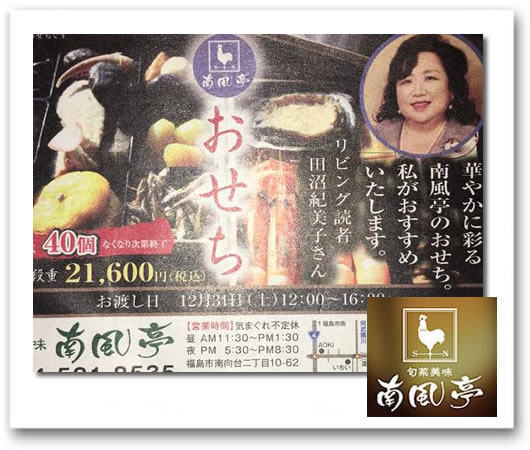 fumie 南風亭です。 あっという間に12月。一年過ぎるのって早いですね。 もうおせち予約受付の時期となりました。 南風亭のおせちは昔ながらのおせち(黒豆、数の子、栗きんとん、田作りなど)も入れておりますが通常会席でお出ししているお料理を特に多く入れております。 甘さ控えめ塩辛さ控えめで保存料は使用しておりませんので、日持ちはしません。 12月26日頃から親方と私と娘の3人で仕込みに入ります。冷房のガンガンきいてるひえひえの中で一つ一つていねいに造り上げます。二段重3〜4人前21600円です。以前ほど人気がなくなってきたおせちではありますが、こころをこめてお造りいたします。ご家族や大切な人との年越しにお一つ。またおひとり様で太っ腹に食すもよし。ぜひどうぞよろしくお願いいたします。