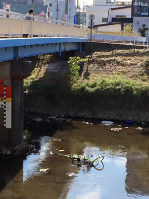 都市河川15年前設計した県内初の車椅子で水辺に降りていけるスロープ、800人の子供達と植えた8000本の森の苗が今6mの河畔林に! 爽やかな休日に最後はガッカリ自転車投棄発見。揚げたい。