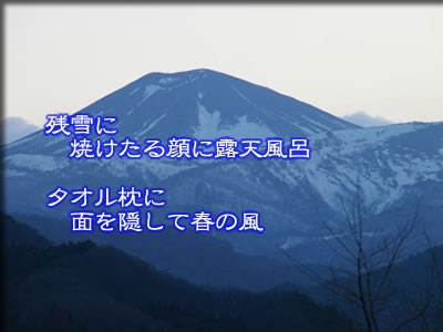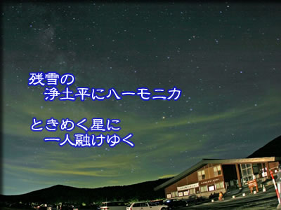 見て分かるとおり、破調の句。大“字あまり”の一句でございます。 開放感に溢れた気持ちそのままに言葉の奔流。 高地での露天風呂というのも、また格別な味わいがあるのでしょう。 何といっても、山歩きの後のひと風呂ですものね。 そして、山の夜は更けて・・・