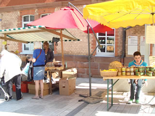 右は蜂蜜のスタンド。ドイツでは趣味で養蜂をする人も多く、プライベートブランドの蜂蜜を売っている。