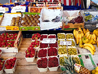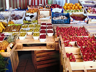 イチゴ、ラズベリー、ブルーベリー、すぐり etc. アプリコットにスモモもある。輸入品のバナナ、ブドウ、キーウイ、パイナップルも並んでる。