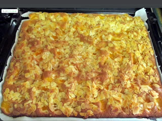 ヴォーカンマーさんは大きな天板に、できた生地を流し入れた。その上にスライスしたりんごを隙間なく敷きつめていく。