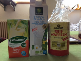 左は豆乳、真ん中は牛乳、右は米粉で作ったポン煎餅。