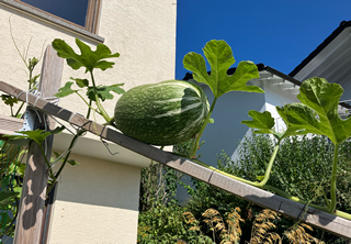 手始めに、庭にある家庭菜園に出てみると。巨大な??ズッキーニだそうだ。自分の重さで落ちてしまわないように支えてある。