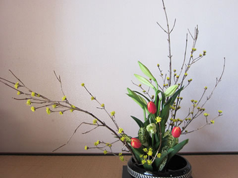 リース作りのお返しに「ハンスさんに日本の生け花を紹介しよう」と思い立った。