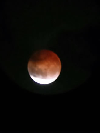 月食開始30分ほど前に空を見上げたら、どどーんとした雲の塊が 南の空を覆っていたので、胃がキリキリする思いがしましたが、 雲の塊はわたあめのようにちぎられ、時折、月を隠したりしやがっ・・・、 いえ、したけれども、素晴らしい皆既を見せてくれました。