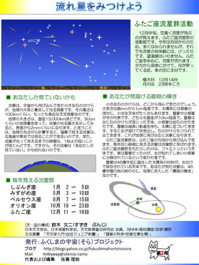 さて、その「ふたご座流星群」は来月中旬に極大日を迎えます。 詳しくは、このページに貼り付けてあるpdfをご覧下さい♪
