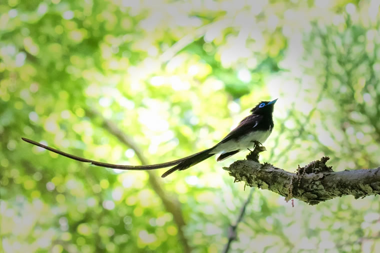 サンコウチョウは、薄暗い森の中で、高いところを飛び回っているので、こんな明るいところに止まってくれることはあまりないようです。まさにビギナーズラックで撮れた幸運の写真です。