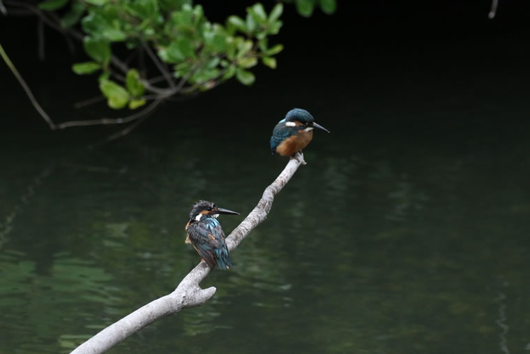 幼鳥の兄弟(オス2羽)が同じ枝に並んでくれました。成鳥になると自分のテリトリーにいる他のカワセミを追い出す習性があるので、幼鳥の時期だけに見られる光景です。
