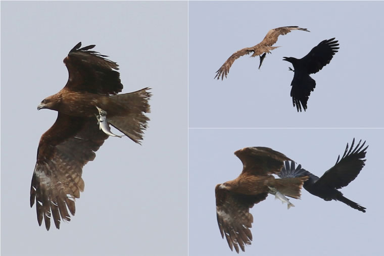 カラスが現れ、魚を横取りしようとしましたが、なんとか無事に持ち去りました。