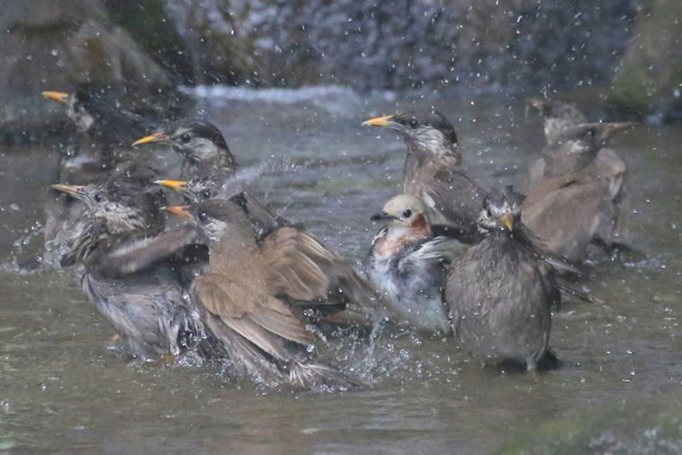 ムクドリの群れの中央で、コムクドリさんが水浴びしていました(白い頭の鳥)。