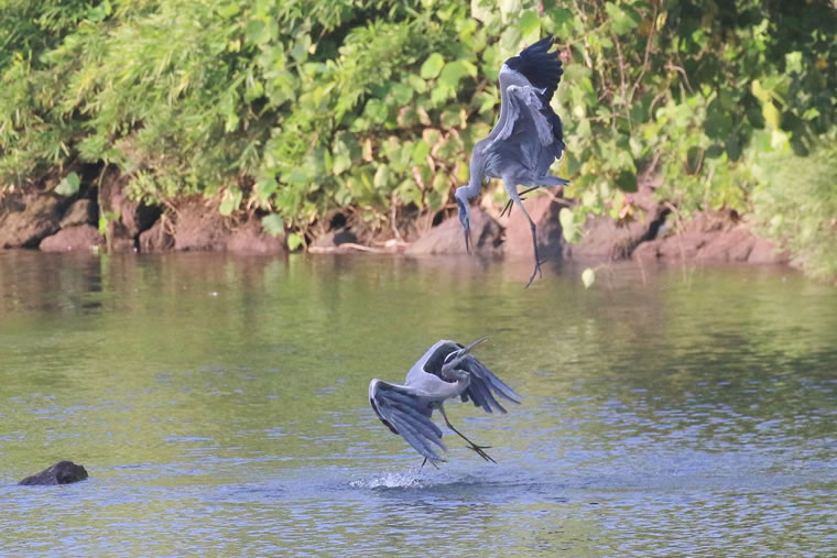 普段は、獲物の魚が近づくのをじっと待っているので、穏やかな印象のアオサギですが、自分のテリトリーへの侵入者には、激しく襲い掛かります。