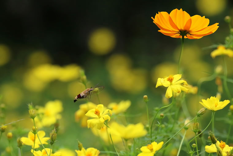 写真中央に写っているのは、ハチドリのように高速で羽根を動かし、空中でホバリングして花の蜜をすう“オオスカシバ”という蛾の一種です。