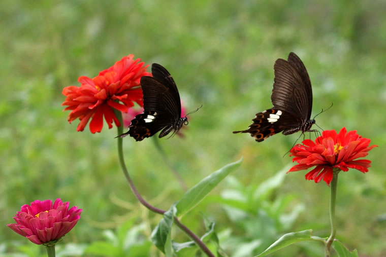 コスモス以外に、ジニアも咲いていて、モンキアゲハも一生懸命、蜜を吸っていました。
