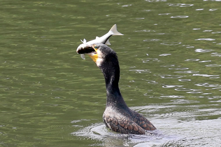 ボラを捕まえた直後、近くのカワウが数羽近寄ってきましたが、横取りされまいと、丸のみしました。丸呑みした魚は傷が付かないので、鵜飼漁はその習性を利用しているんですね。