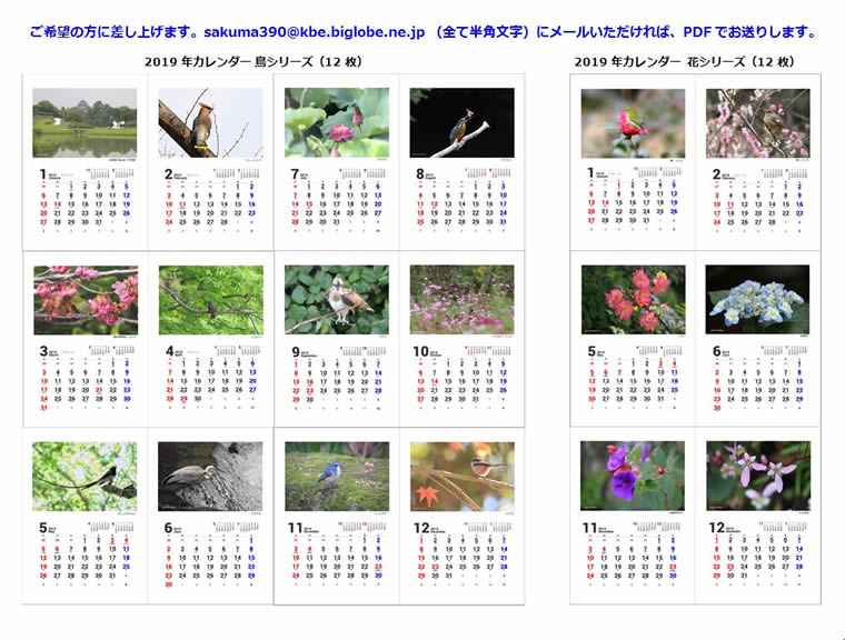 自分用に2019年カレンダーを作成しました。ご希望の方に差し上げますのでメールください。