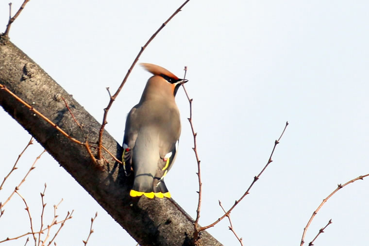 ヒレンジャクは尾が緋色(赤)ですが、尾が黄色いキレンジャク が1羽だけ混じっていて、幸運にも撮ることができました。