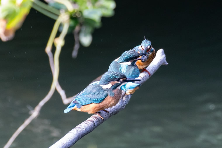 7月になり近くの公園では、カワセミの 幼鳥が巣から出てきて、親から獲物をも らう愛らしい光景が見られるようになり ました。