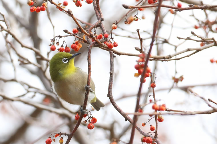 葉は既になくなり、赤い実だけが残った枝にメジロさんが止まってくれました。