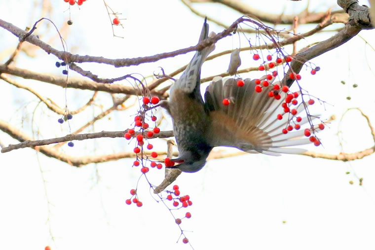イイギリの実を空中でホバリングしながら、啄ばんでいました。