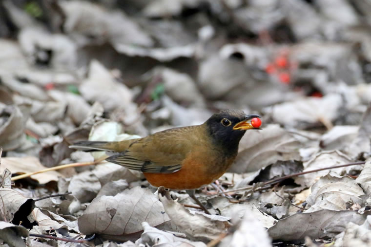 枯葉の中のイイギリの実を見つけては、次々に啄ばんでいました。