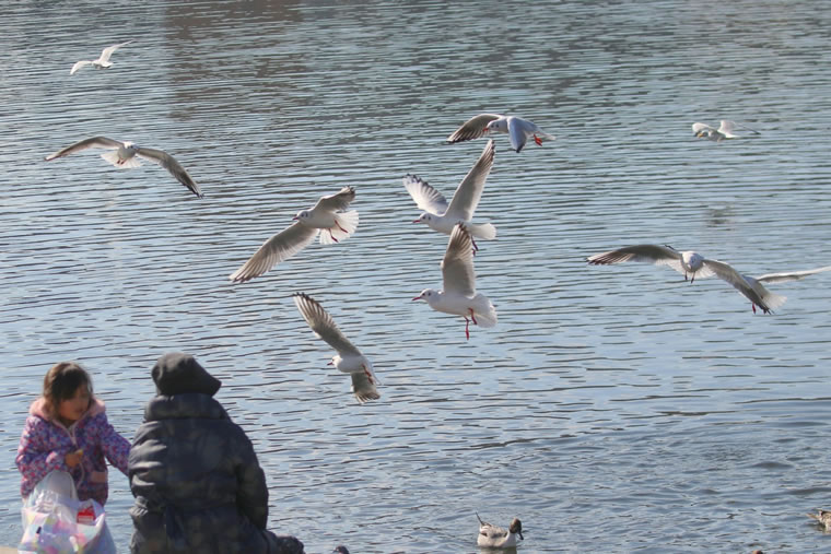 海岸の他、河川や湖沼など、最も内陸まで飛来するカモメです。住宅に囲まれた気水湖で、女の子が持っているエサを見つけて群がってきました。