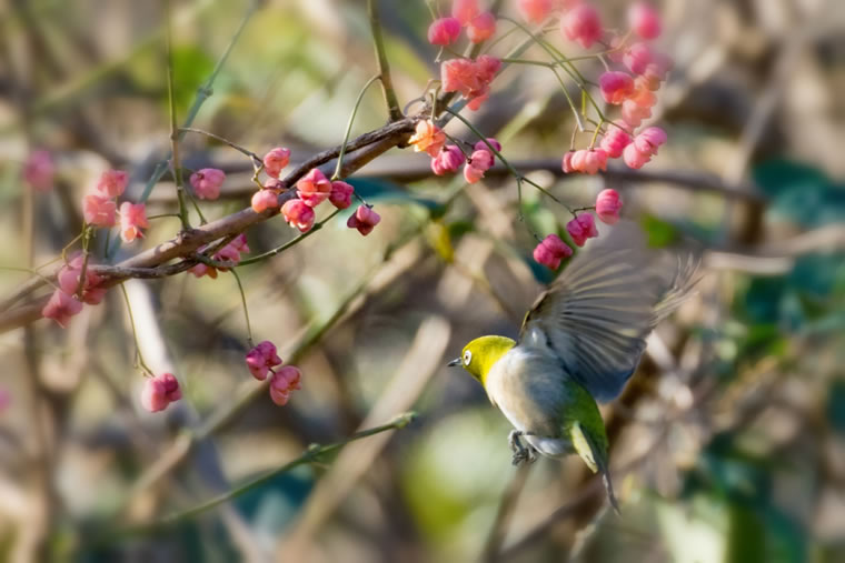 ピンク色はマユミの花です。この花の中には赤い実があり、これをメジロが頻繁に啄ばみにきています!