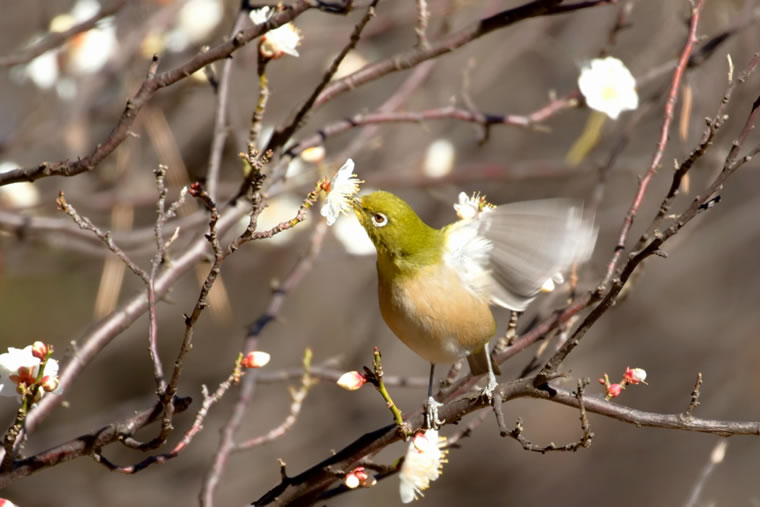 空気はまだまだ冷たいですが、白梅が咲き始め、メジロたちが蜜を吸いに集まってきました。
