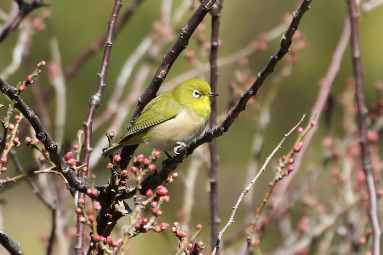 白梅の蜜を吸いに来たメジロさんが紅梅 にも止まってくれました。
