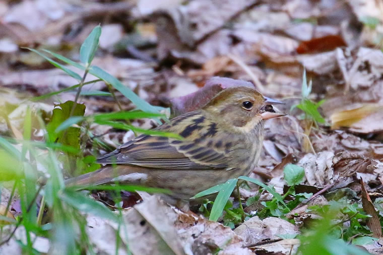 アオジとほぼ同寸で、本州の高山で繁殖 し、秋冬は根雪のない地域の暗い林内のやぶに移動してきます。