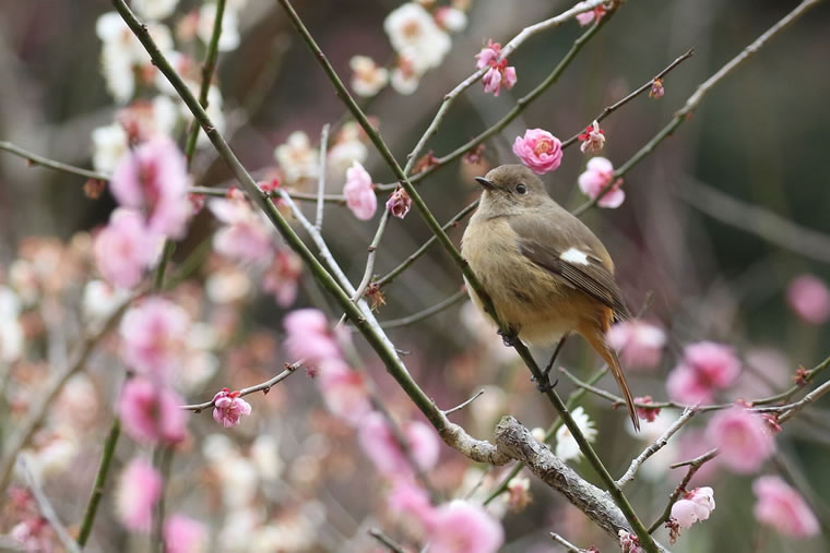 満開に近い紅梅にジョウビタキのメスが止まってくれました。