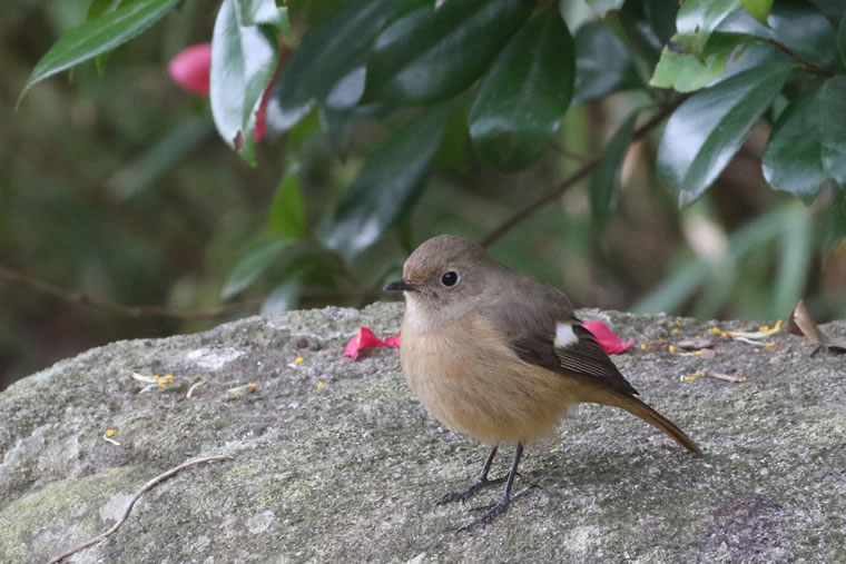 こちらも、散り始めた椿の花のところにジョウビタキのメスが舞い降りてくれました。