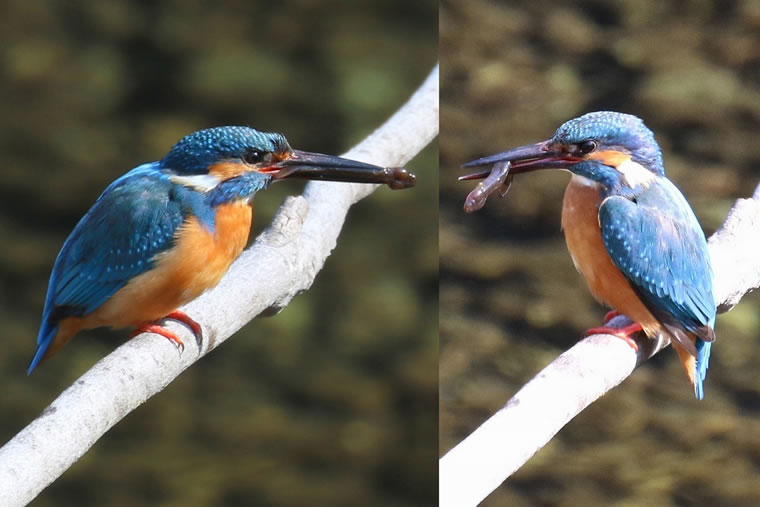 2枚の写真を並べました。同じオスです。右:獲物をゲットして枝に止まりました。左:いつもならすぐに飲み込んでしまうのですが、この日は逆向きに頭を先にして持ち帰りました。メスにプレゼントする求愛給餌でしょうか!今年もカップル成立、幼鳥誕生が待ち遠しいです。