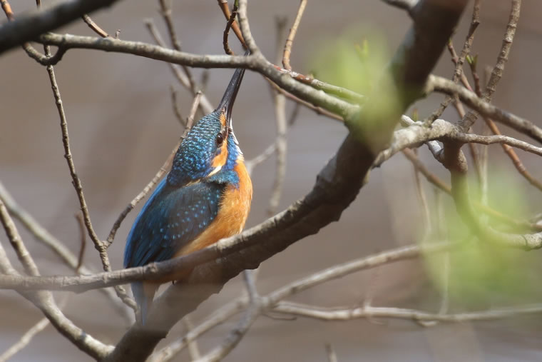 公園に着くと、幸運にも、すぐに新芽が出始めた枝の合間にカワセミさん(オス)に会えました。