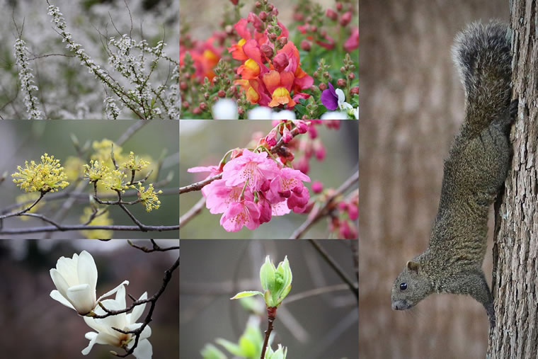ユキヤナギ、サンシュ、ボケ、キンギョソウ、サクラ(横浜緋桜)が咲き誇り、色鮮やかな新芽の合間を、リスが駆け回っていました。