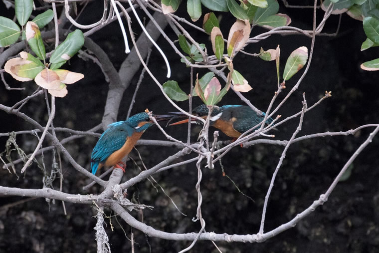 暫くして、オス(左)が再度捕ってきた魚をメスにあげようとしています。これが “求愛給餌(きゅうあいきゅうじ)”です。メスがこれを受け入れてくれると、カップル成立です。今年も巣作りして、幼鳥が無事に育って姿を見せてくれるのが待ち遠しいです。