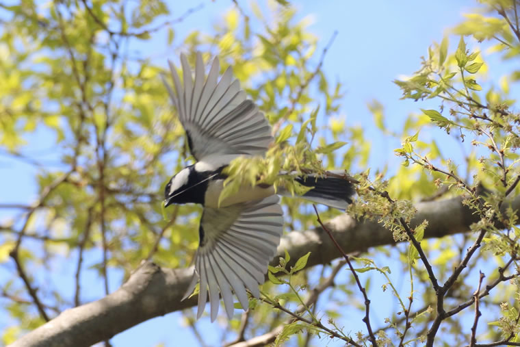 シジュウカラ(四十雀)が、新芽を啄ばんでいたので、何枚か写真を撮っていたら、飛び出しの瞬間が撮れました!